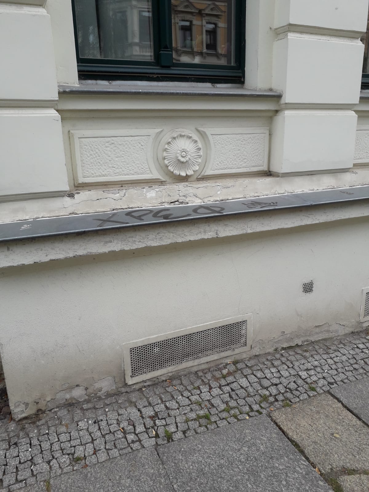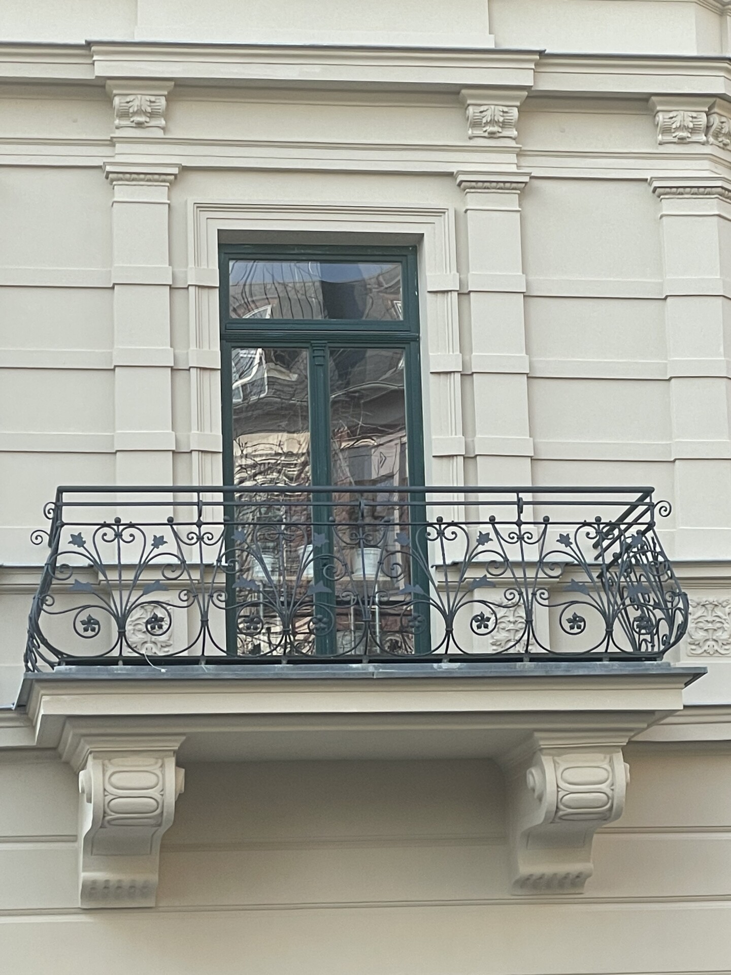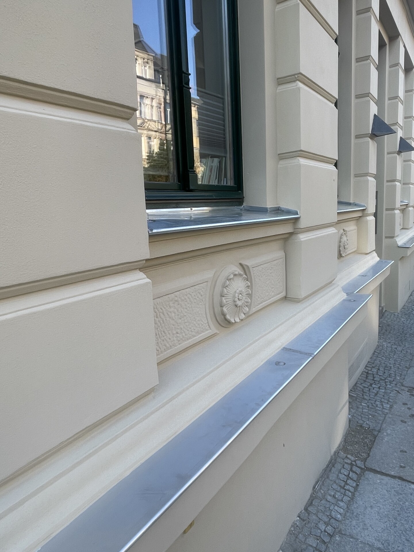 Fassade nach SanierungsarbeitenFertiggestellte FassadeFassadendetail Fensterachse nach FertigstellungFassadenverblechung nach SanierungSanierter BalkonFassadengesims geschädigt vor SanierungFassadengesims geschädigt vor SanierungSockelbereich mit Gesims im BestandFassadenschmuck im Bestand vor Sanierung