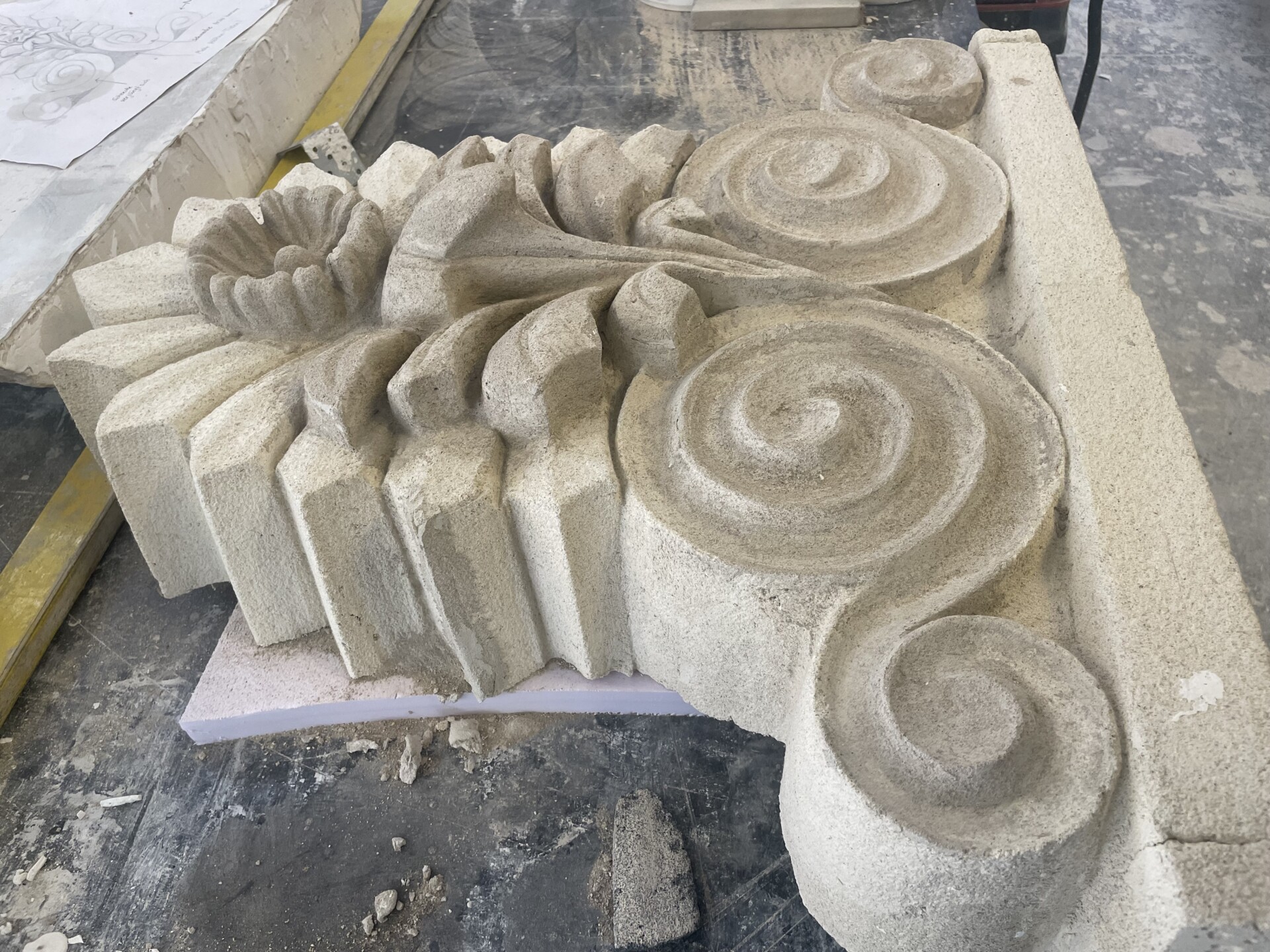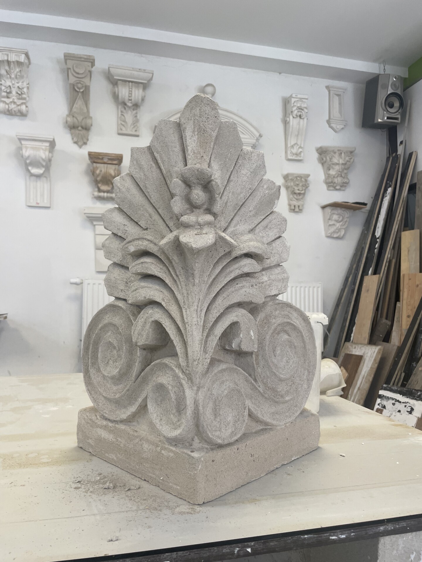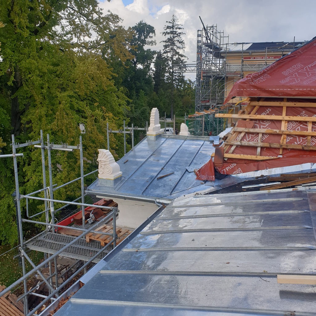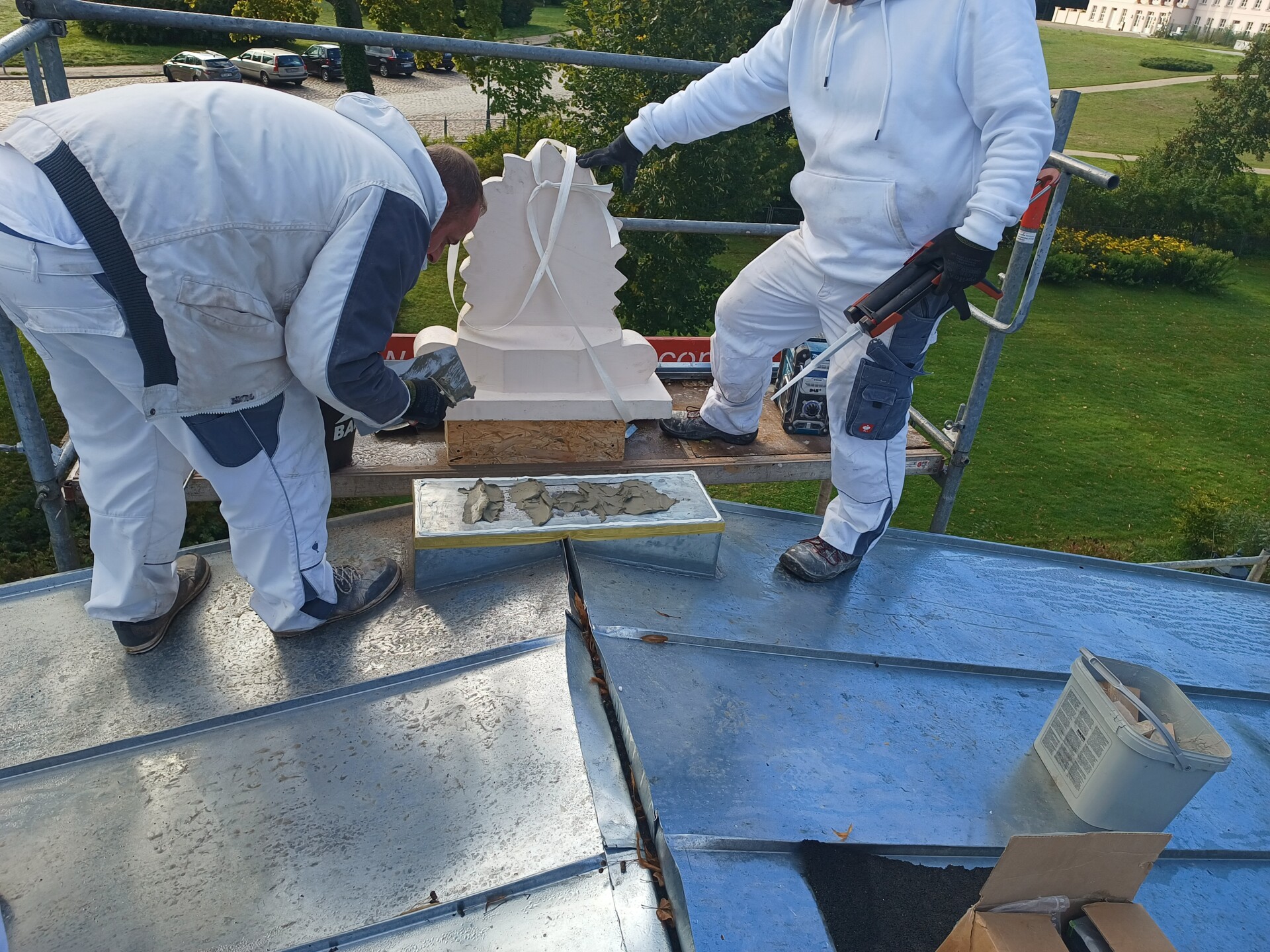 Beauftragung für Neuherstellung der DachzierSchlossanlage „Orangerie“ Historisches FotoSelbstentwickelte, neu hergestellte EckakroterieNeuherstellung nach Eigenentwurf Dachzier, hier MittelakroterieMontage DachzierFertig gesetzte Elemente