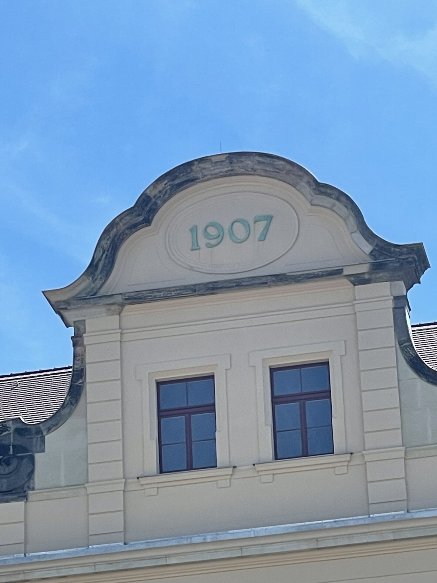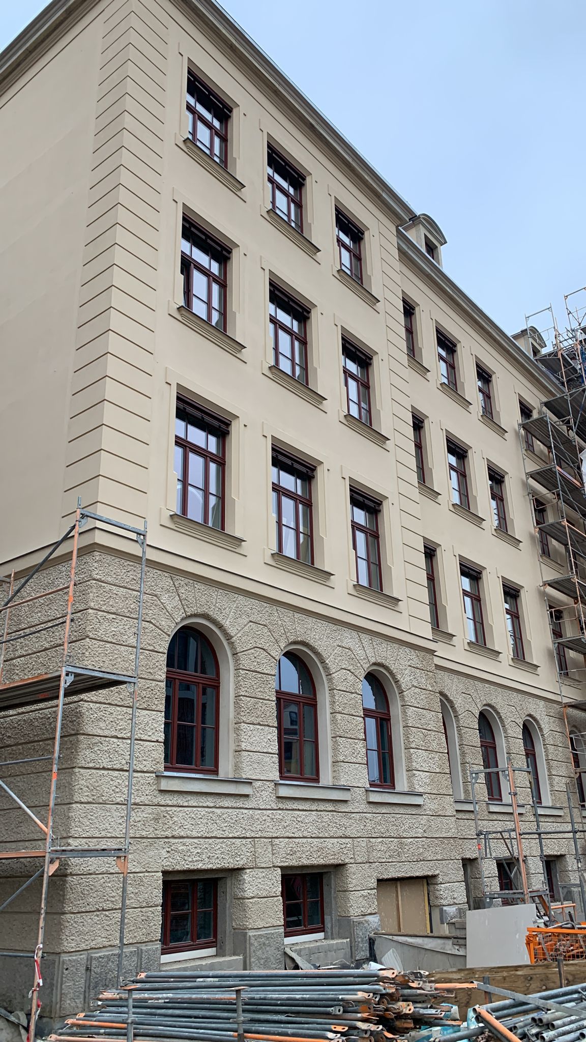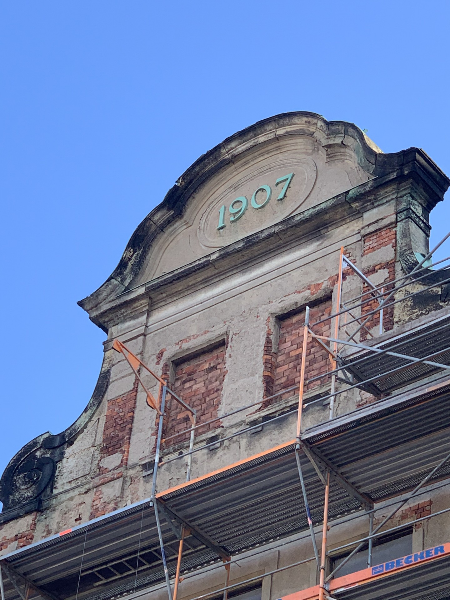 Fertiggestellte HauptfassdeFertiggestellte FassadenachseRestaurierter SchmuckgiebelNeu hergestellte Turmdachreiter nach historischer VorlageFassade im DetailFassade im UrzustandFassadendetail in situFassade im BestandFassade im UrzustandFassade im Urzustand (2)Neuherstellung Fensterrahmungen und Fensterbänke