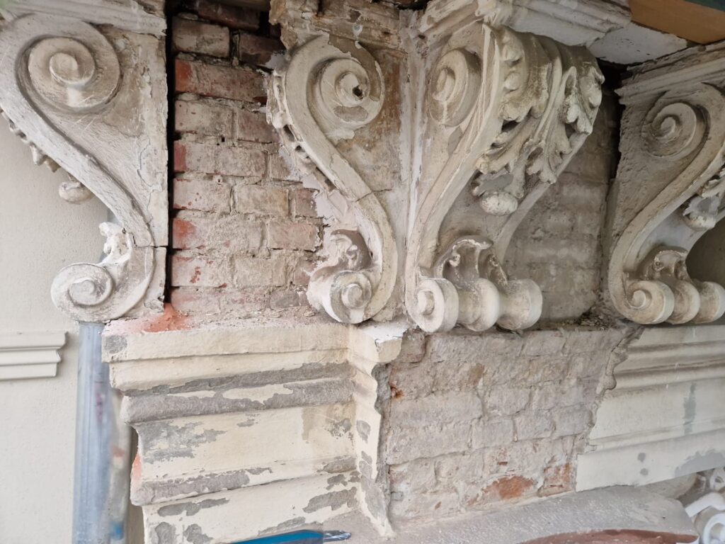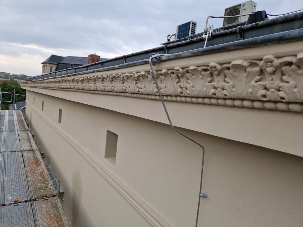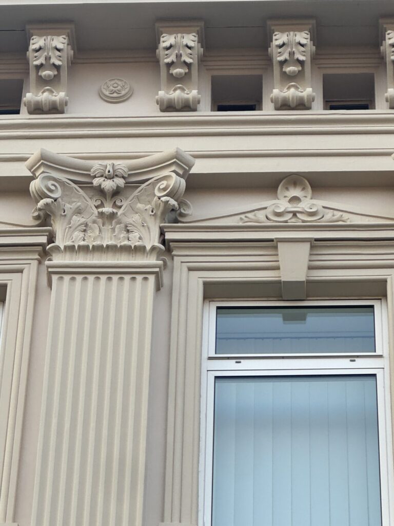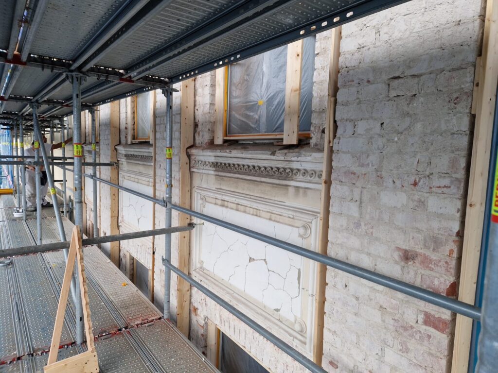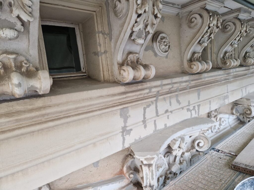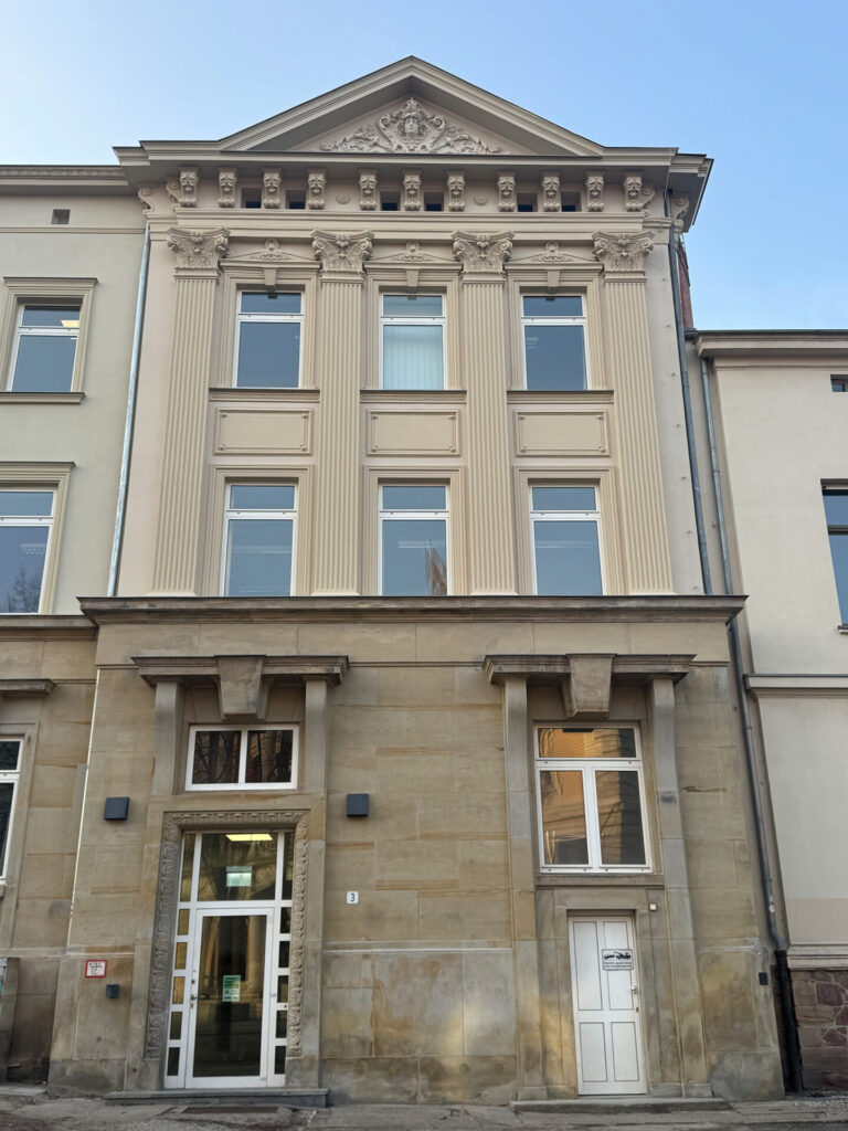 Historische Achse Uni Halle AG Martin-Luther-Uni Halle fertiggestellte Fassadenachse saniertes Hauptrisalit Fassade im Bestand Fassadendetail restaurierte Achse restauriertes Traufgesims Fassadenelemente in Überarbeitung marode Fassadenzier Bestand