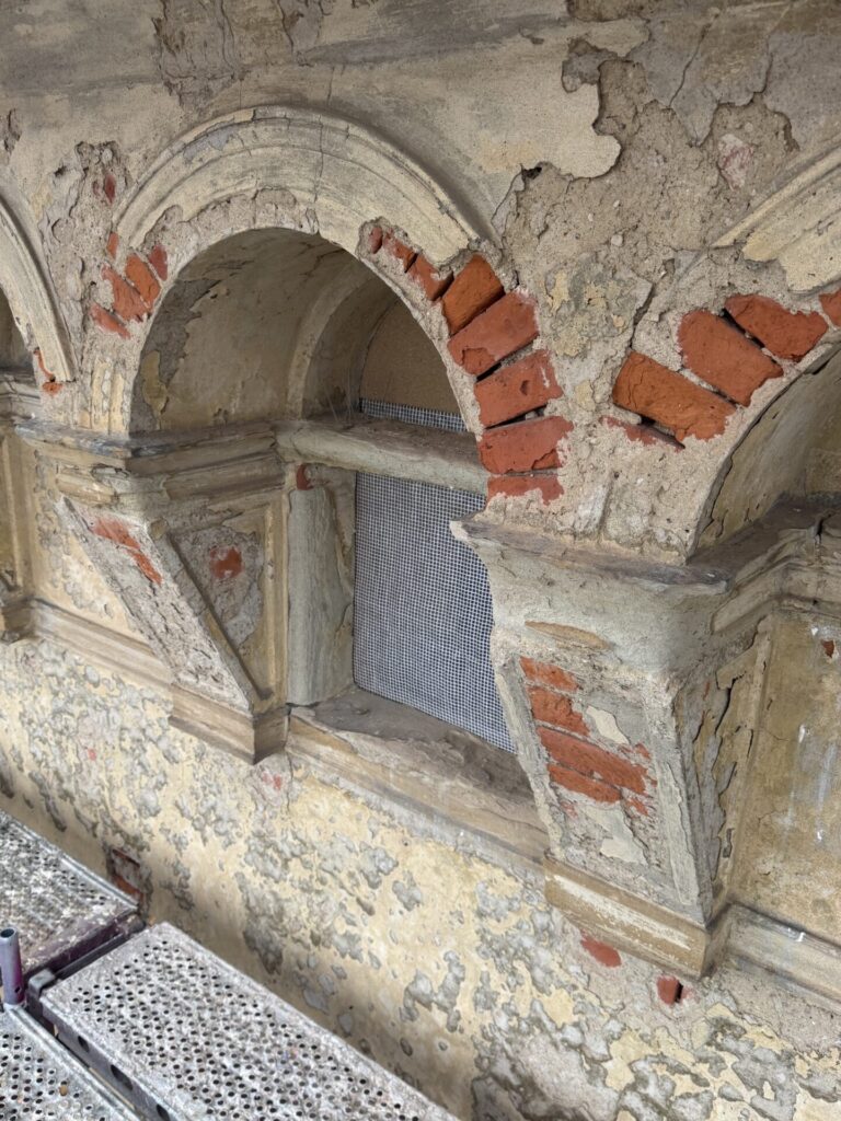 Fassade im Bestand mit desolatem Putz, Stuck und Naturstein